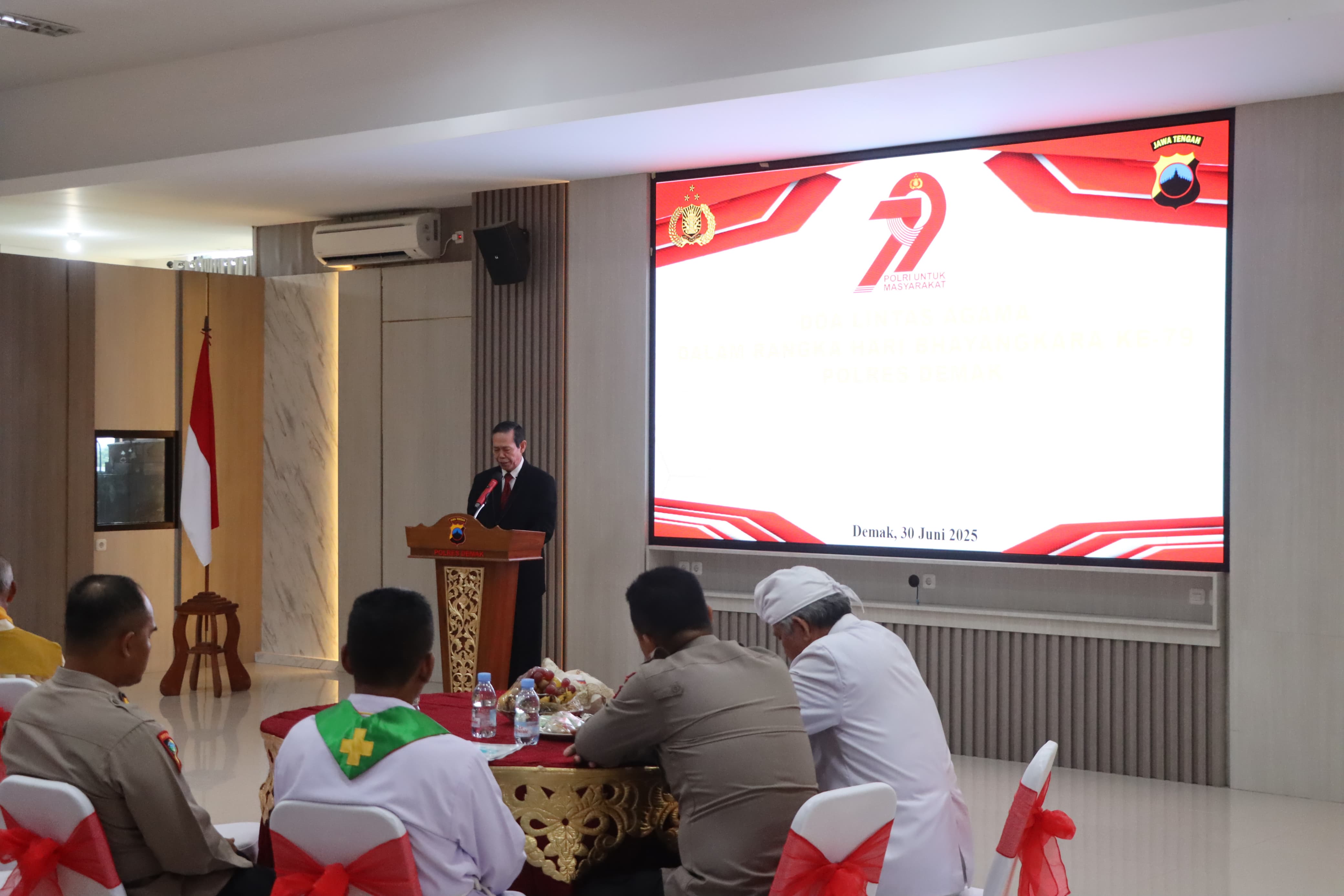 golekinfo | Demak — Dalam rangka memperingati Hari Bhayangkara ke-79 yang jatuh pada 1 Juli 2025, Kepolisian Resor Demak menggelar acara doa bersama lintas agama di Aula Wicaksana Laghawa, Senin (30/6). Kegiatan ini dihadiri oleh jajaran pejabat Polres, tokoh agama, dan perwakilan dari berbagai kepercayaan di Kabupaten Demak.